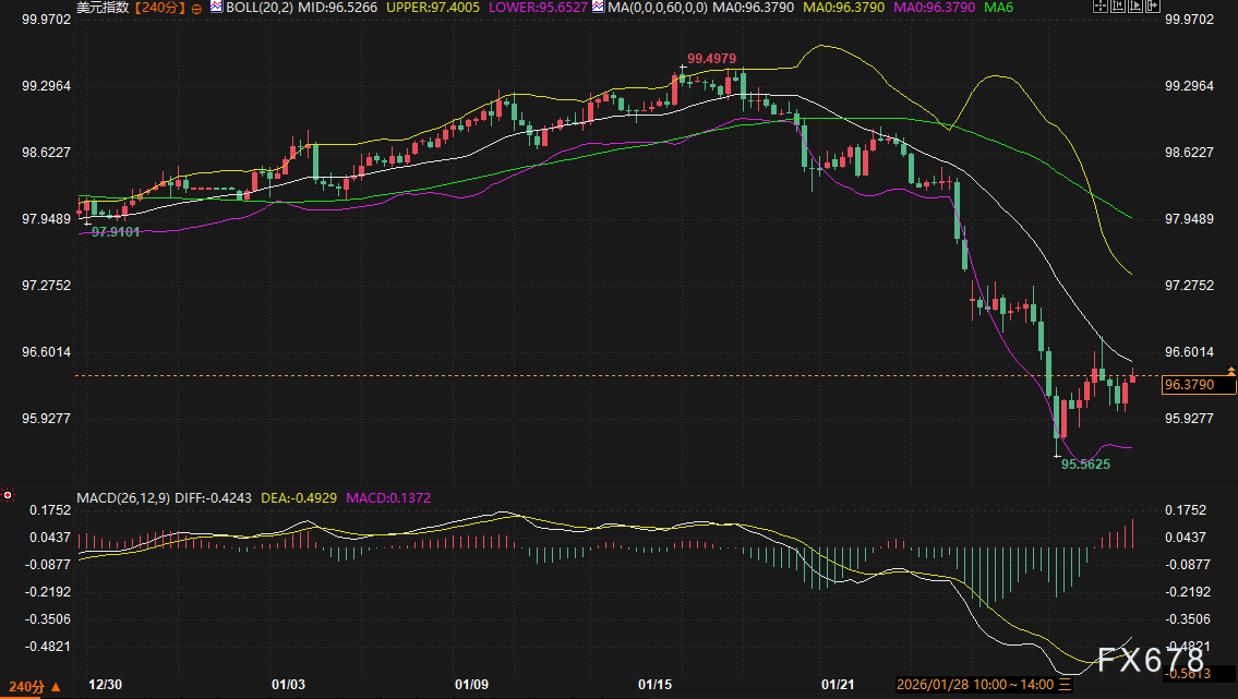 这一曲线陡峭化(即长端利率相对上升或短端利率相对下降)的过程,通常反映了市场对长期通胀或经济增长预期的重新定价,或是对于未来国债供应压力的担忧。从具体点位看,5年期收益率一度触及3.88%的近期新高,上方关键阻力在3.90%-3.93%区域;而30年期收益率则在4.90%附近遭遇压制。收益率的上升,尤其是长端,理论上应对外币投资者构成一定吸引力,但当前的市场行为却显示,这并未转化为对美元的强劲需求。相反,分析认为,美元的下跌能在贸易环境中降低美国出口成本并刺激经济,某种程度上符合政策目标。因此,美债收益率的稳健与美元的走弱并存,揭示了当前市场的核心矛盾:对美元资产的信心仍在,但对美元汇率的偏好下降。 VT官网:从技术面看,美元指数240分钟图已跌破96.3656的关键支撑,布林带向下开口,价格运行于中轨(96.5259)下方,MACD于零轴下方运行,表明短期空头趋势明确。盘中需密切关注能否重新站稳96.40-96.60区域,若持续承压于此区域下方,下一支撑将看向95.50-95.80区间。