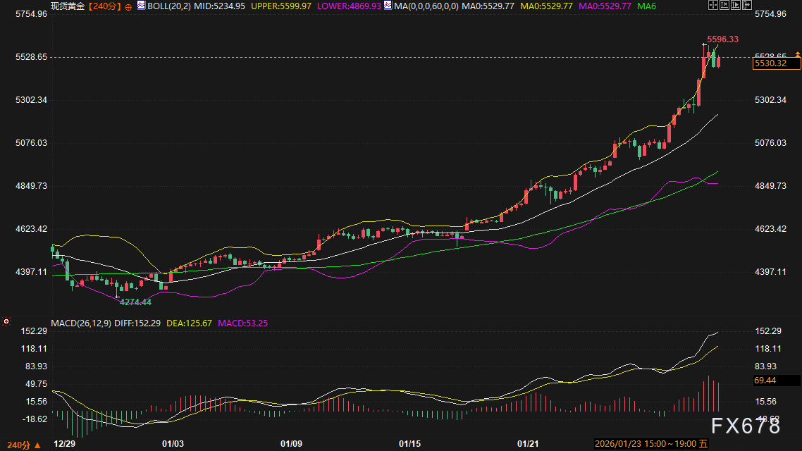 黄金避险买盘炽热,但技术极端引发回调忧虑 黄金的暴涨是当前市场最引人注目的景象。其上涨动能部分源于美元的系统性走弱,但更主要的是由强烈的避险情绪驱动。这种避险情绪并非完全来自对美债信心的丧失,而是可能源于对全球地缘局势(如俄乌局势)的持续焦虑,以及对特朗普关税言论可能引发新一轮市场动荡的担忧。资金流向黄金这类被视为终极避险的资产,尽管其流动性远不如美元。 VT官网:然而,黄金的上涨已进入极端区域。有分析尖锐指出,当前黄金的上涨“极度无序”,且显著增加了反转风险。从技术指标看,现货黄金240分钟图显示价格已突破布林带上轨(5600.26美元),MACD指标金叉且正值持续放大,多头动能强劲。但一个关键风险信号是:金价已远超20个月布林带上轨(约4812美元/盎司),这种走势在技术上被定义为“极度拉伸”。历史上,任何极端走势都是潜在风险的信号。更值得玩味的是,尽管金价飙升,但期货市场的净多头仓位并未达到与之匹配的历史高位,这表明本轮买盘可能来自不同的、或许更倾向于中长期持有的资金(如央行或大型机构),而非纯粹的短期投机盘。一旦这部分买盘力量暂歇,市场缺乏后续接力,技术性回调的压力将急剧增大。 关键阻力区间:5600 - 5650美元。此处是当前布林带上轨延伸区域及整数心理关口,金价在此区域已显现冲高回落压力。 核心支撑区间:首先关注5500 - 5530美元,此处是近期强势上涨的盘中整理平台及心理支撑。更重要的支撑在5400 - 5430美元区域,该区域汇集了前期高点转化支撑及短期趋势线。 盘中关注点:需密切关注金价对5600美元关口的反复测试情况,以及每次冲高后的回落力度。若跌破5500美元,则可能意味着短期调整深度将加大。
