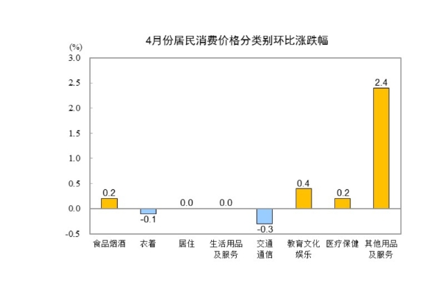 4月份,全国居民消费价格环比上涨0.1%。其中,城市上涨0.2%,农村持平;食品价格上涨0.2%,非食品价格上涨0.1%;消费品价格持平,服务价格上涨0.3%。
