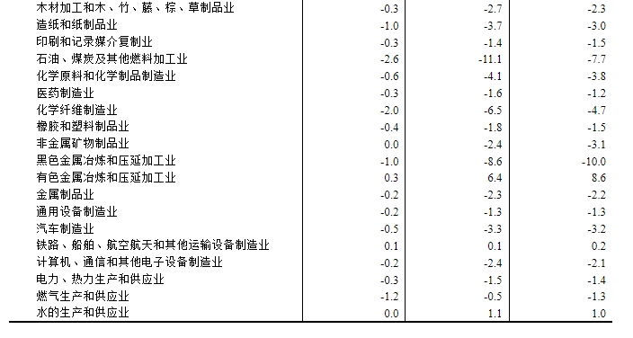 工业生产者购进价格中,燃料动力类价格下降2.3%,化工原料类价格下降0.7%,黑色金属材料类价格下降0.6%,建筑材料及非金属类价格下降0.4%,农副产品类、纺织原料类价格均下降0.2%;有色金属材料及电线类价格上涨0.7%。