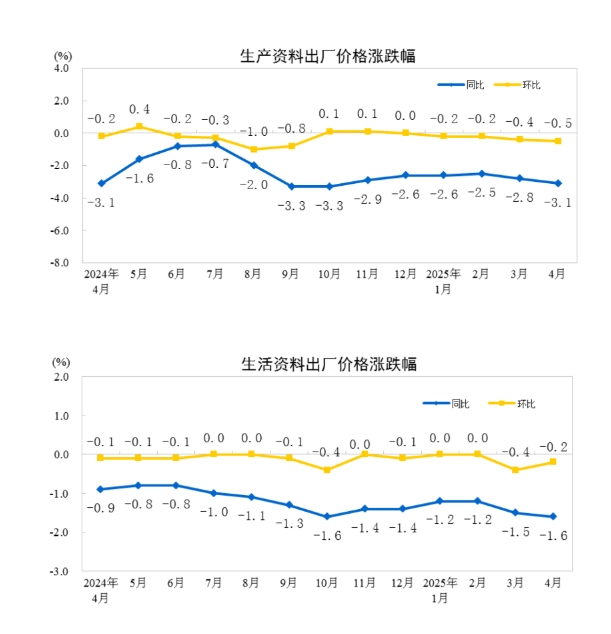 2025年4月份,全国工业生产者出厂价格同比下降2.7%,环比下降0.4%;工业生产者购进价格同比下降2.7%,环比下降0.6%。1—4月平均,工业生产者出厂价格和购进价格比上年同期均下降2.4%。