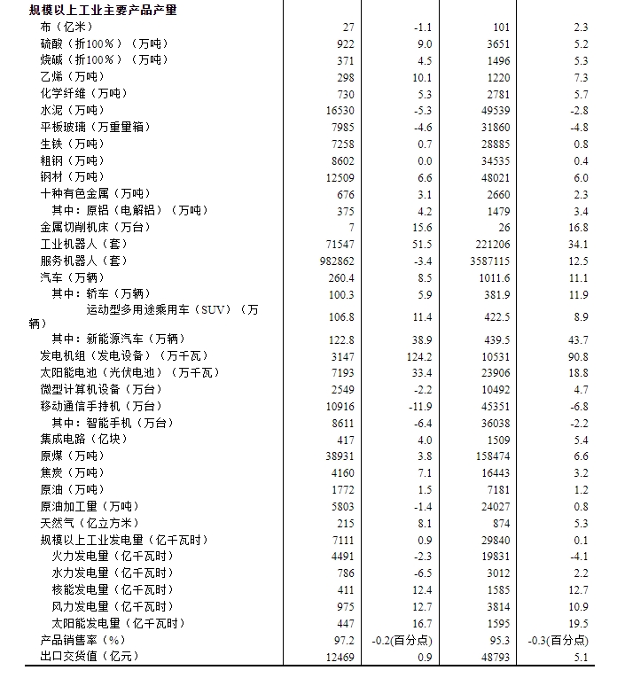 由于规模以上工业企业范围每年发生变化,为保证本年数据与上年可比,计算产品产量等各项指标同比增长速度所采用的同期数与本期的企业统计范围尽可能相一致,和上年公布的数据存在口径差异。主要原因是:(一)统计单位范围发生变化。每年有部分企业达到规模纳入调查范围,也有部分企业因规模变小退出调查范围,还有新建投产企业、破产、注(吊)销企业等影响;(二)部分企业集团(公司)产品产量数据存在跨地区重复统计现象,根据专项调查对企业集团(公司)跨地区重复产量进行了剔重。