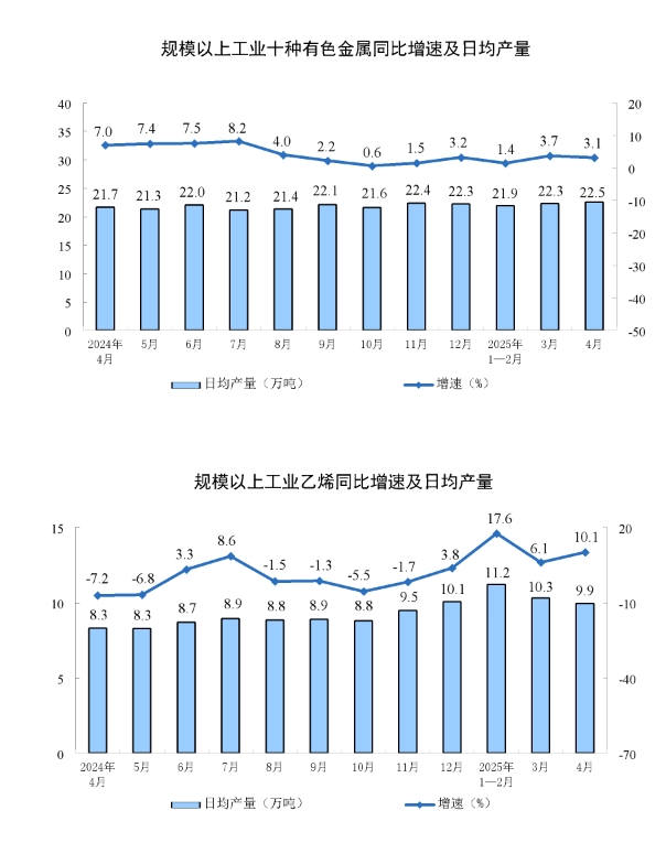 分产品看,4月份,规模以上工业623种产品中有341种产品产量同比增长。其中,钢材12509万吨,同比增长6.6%;水泥16530万吨,下降5.3%;十种有色金属676万吨,增长3.1%;乙烯298万吨,增长10.1%;汽车260.4万辆,增长8.5%,其中新能源汽车122.8万辆,增长38.9%;发电量7111亿千瓦时,增长0.9%;原油加工量5803万吨,下降1.4%。