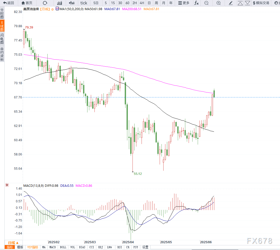 “如果核协议无法达成,伊朗有权对美国驻军设施采取反制措施。”他说道。此前,美国方面多次表示将对伊朗采取军事行动,若其拒绝达成新的核协议。   除了中东紧张局势外,市场对于亚洲大国与美国之间的贸易担忧情绪有所缓和。市场预期,如果两国能够在近期取得实质性进展,全球两大经济体的能源需求将同步回升,从而支撑全球原油需求增长预期。   美国原油库存降幅超预期,进一步支撑油价。   美国能源信息署(EIA)公布的数据显示,上周美国商业原油库存减少了360万桶,总库存降至4.324亿桶,远超市场此前预计的200万桶降幅。   这一超预期的数据进一步强化了市场对于供应收紧的判断。市场分析师马克·亨森(Mark Hansen)指出:“库存大幅下降显示出美国原油出口及需求韧性依旧强劲,为油价提供了额外支撑。”   从日线图形来看,WTI原油自4月初低点以来呈现稳步上升趋势,当前价格已经突破此前的关键阻力位67.80美元一线。技术指标方面,短期均线(如5日与10日均线)形成金叉,显示短线动能持续增强;   相对强弱指标(RSI)徘徊在60-70区间,尚未进入超买区域,暗示仍有进一步上行空间。此外,若后续能够有效站稳68.50美元上方,多头或将进一步挑战70美元关口。