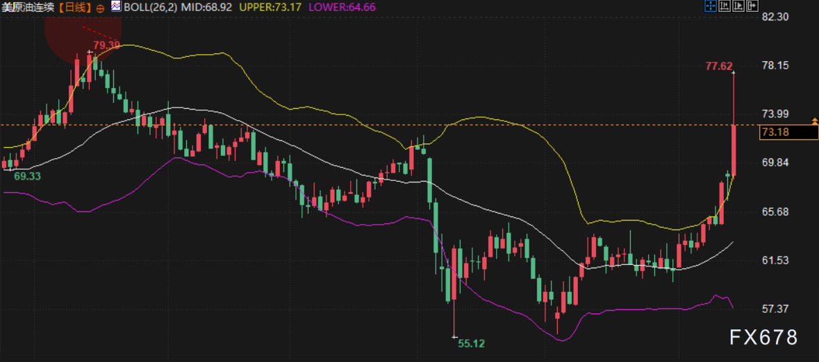 美原油收于每桶73.18美元,上涨超6%。盘中美原油一度跳涨超过14%,达到1月21日以来的最高价 77.62 美元/桶。两个指标原油都创下了自 2022 年俄乌冲突导致能源价格飙升以来的最大盘中波动。