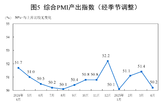 4月份,综合PMI产出指数为50.2%,比上月下降1.2个百分点,继续高于临界点,表明我国企业生产经营活动保持扩张。