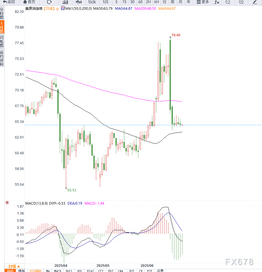 此外,K线结构呈现“下跌旗形”整理形态,若油价跌破64.50美元关键支撑,可能引发进一步下探至63美元甚至60美元区域的风险;反之,若能重新站上20日均线(约在66美元附近),才有望恢复反弹动能。