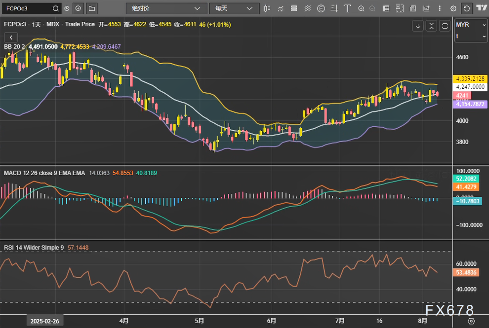 马来西亚棕榈油期货本周四(8月7日)连续第二个交易日收跌,基准10月合约(FCPOc3)收盘报4241林吉特/吨,跌幅0.61%。日线技术指标显示,价格位于布林通道中轨(4491林吉特)下方,MACD柱状收缩,RSI(14)维持在57.14的中性区间,市场短期或延续震荡偏弱格局。