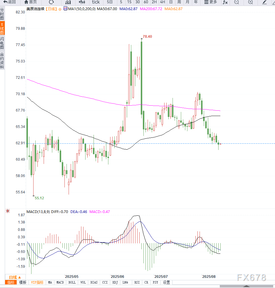 若价格突破该阻力,或有望向65.50美元发起测试;反之,若跌破62.50美元支撑,可能进一步回落至61.80美元甚至60.50美元一线。技术指标MACD仍位于零轴下方,但红柱开始缩短,显示空头动能有所减弱。