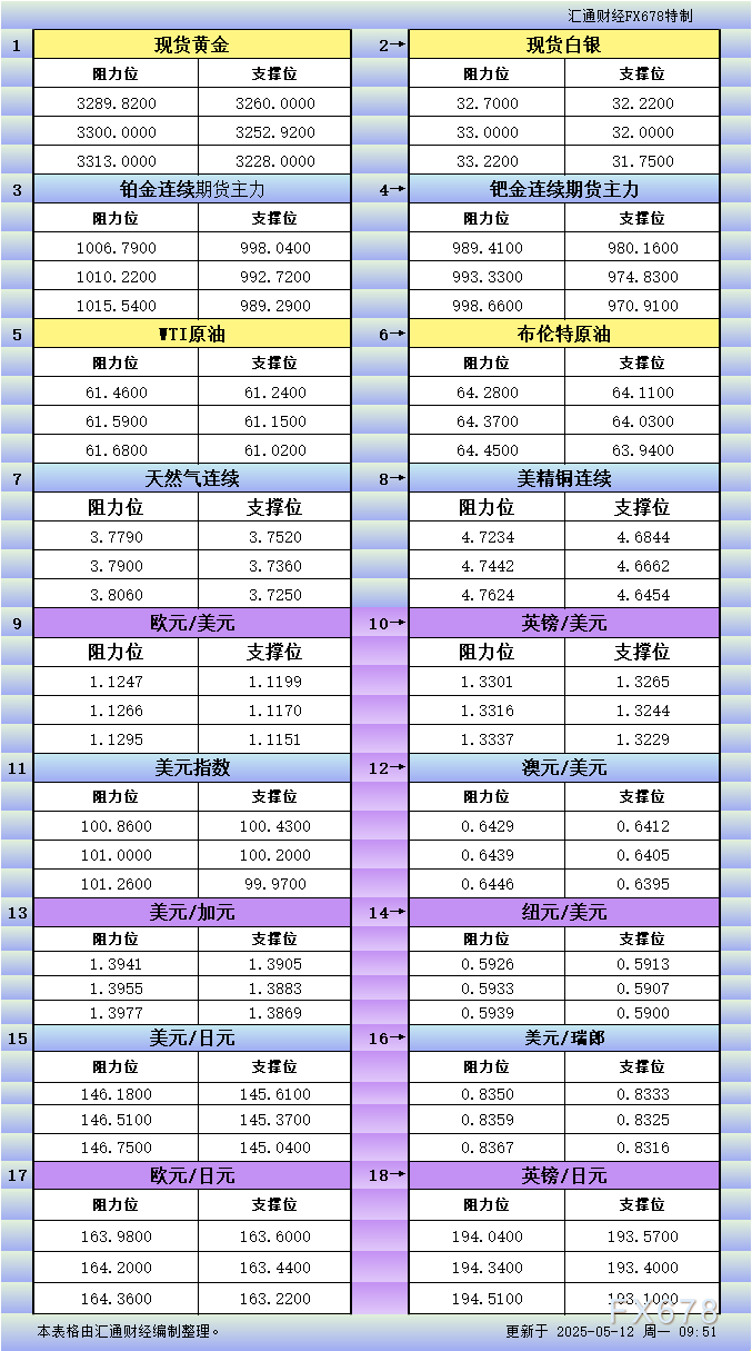 VT登陆入口:5月12日美市更新支撑阻力:18品种支撑阻力(金银铂钯原油天然气铜